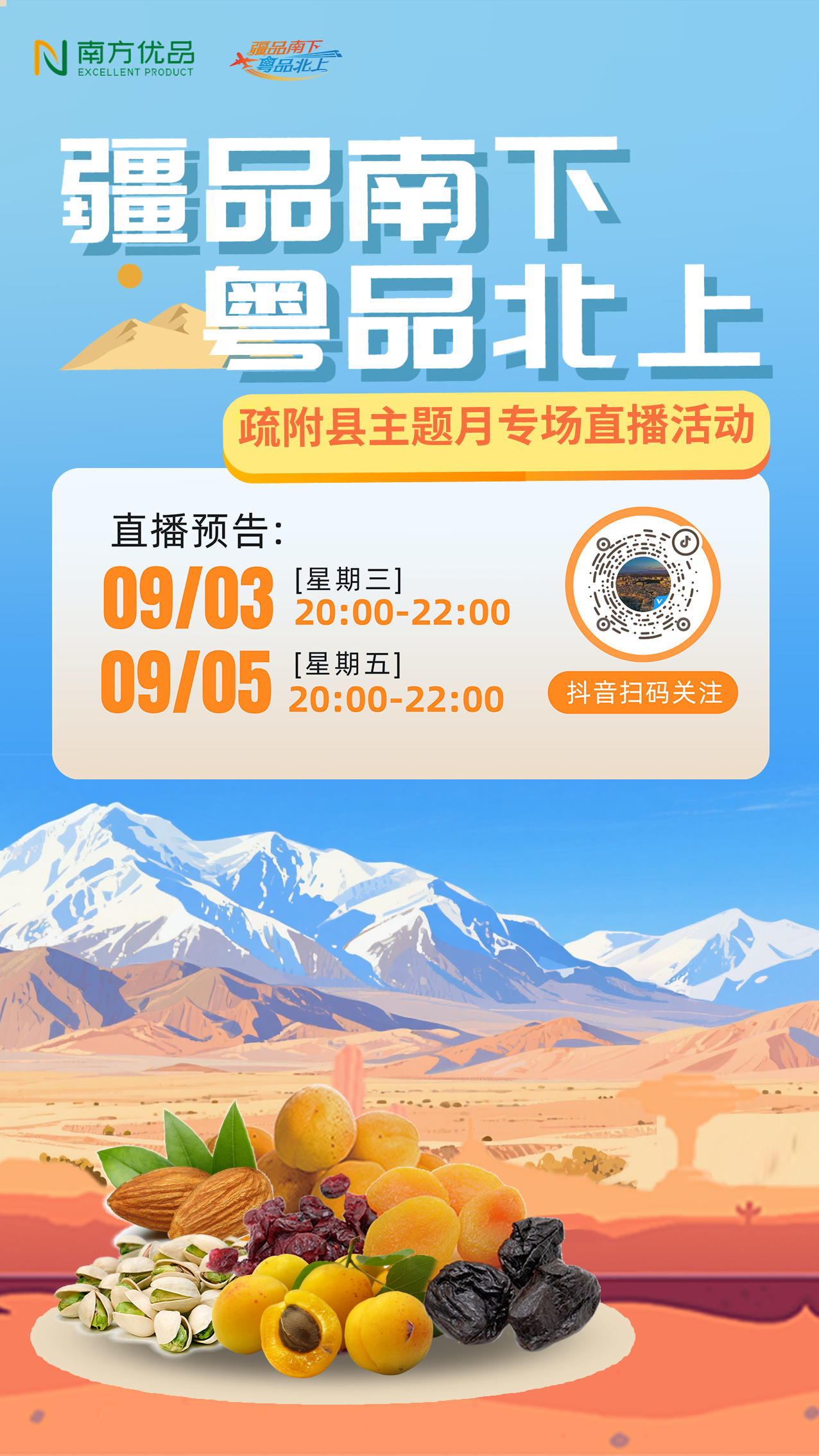 金秋九月,锁定“疆品南下 粤品北上”线上平台,让疏附杏脯的蜜甜、核桃的油香、沙棘汁的清爽,成为你九月的“幸福秋实”。