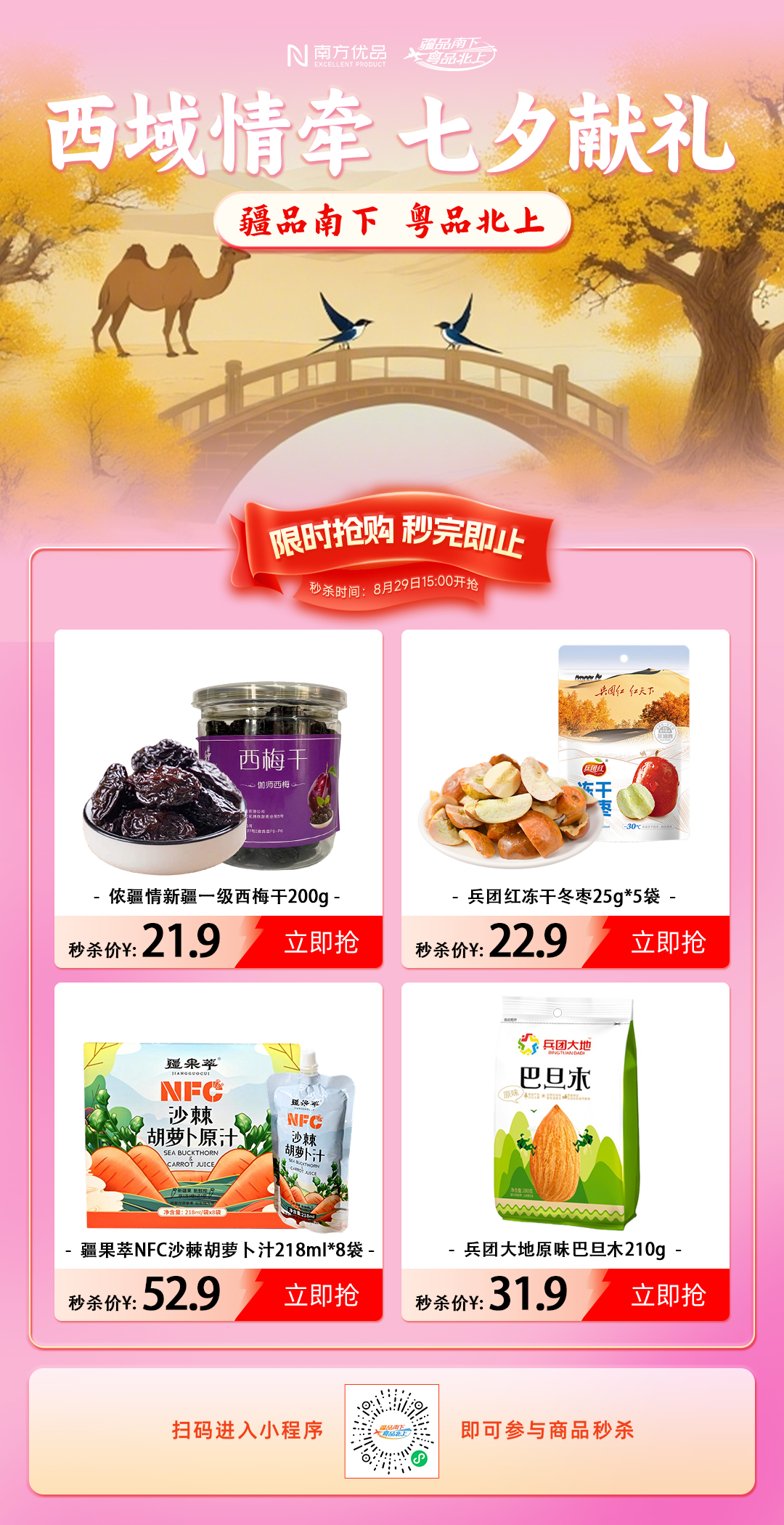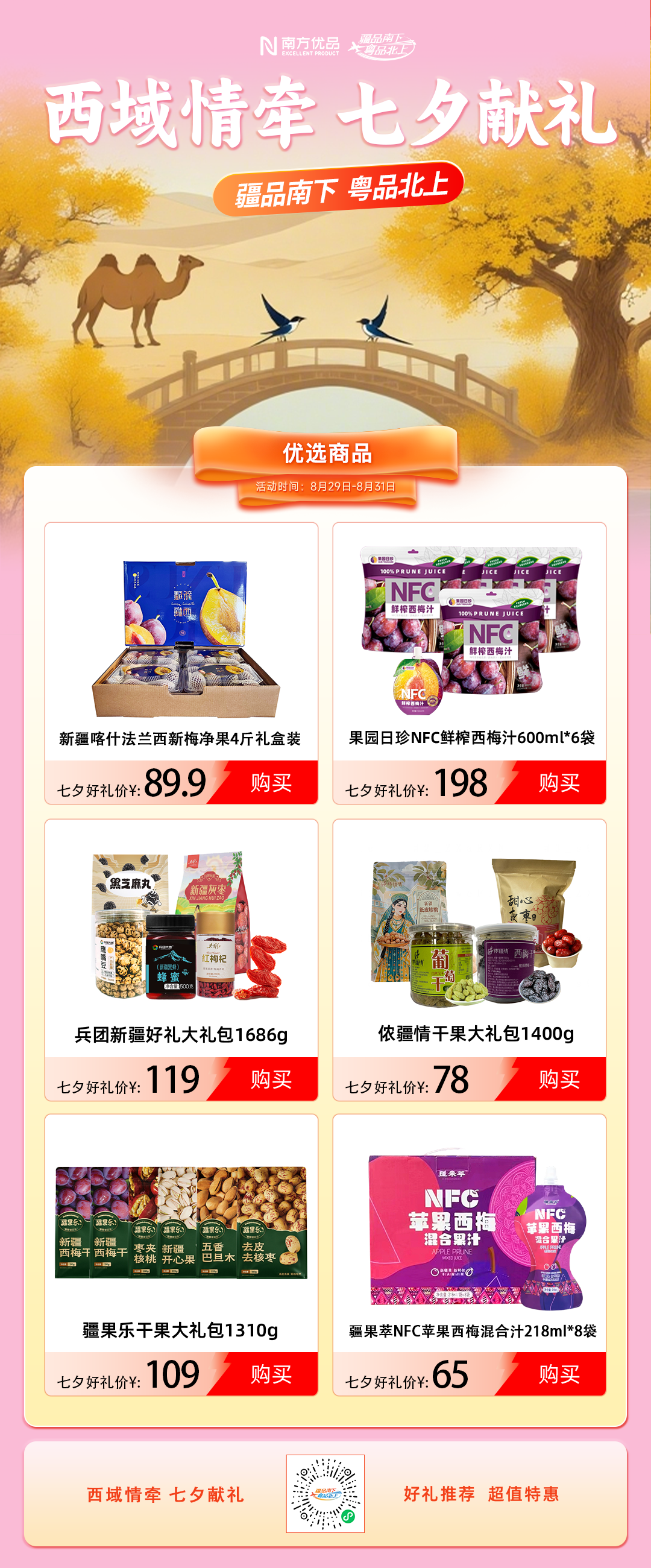 “金风玉露一相逢,便胜却人间无数”,8月29日—31日,“疆品南下 粤品北上”线上主平台特别推出“西域情牵 七夕献礼”主题促销活动,以伽师新梅为媒,为湾区民众送上跨越5000公里的节日心意。